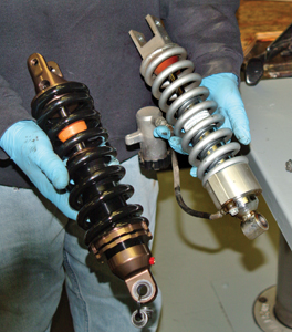 There was no scale handy, but the “heft-in-hand” method revealed little difference in the weights of the two units. However, the Progressive Suspension 465 Series Shock has a highly polished, hard-anodized housing and mounts, and a powdercoated, gloss black spring. It looks more like a trophy than something to hide in the dark backside of an adventure-touring motorcycle. Configurations are available for a variety of on/offroad applications and for sportbikes and metric cruisers. All 465 models offer a high-pressure gas monotube design with a 46mm bore, a 16mm hard chrome shaft tracking in Viton seals and a one-year limited warranty. MSRP is $495.95.