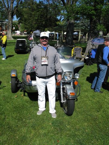 That's gadfly Mike Wozniak blocking the view of his 2003 Centennial Harley-Davidson Ultra Electra Glide and sidecar; Mike dresses funny, owns a dozen motorcycles, and occasionally runs for governor of California.
